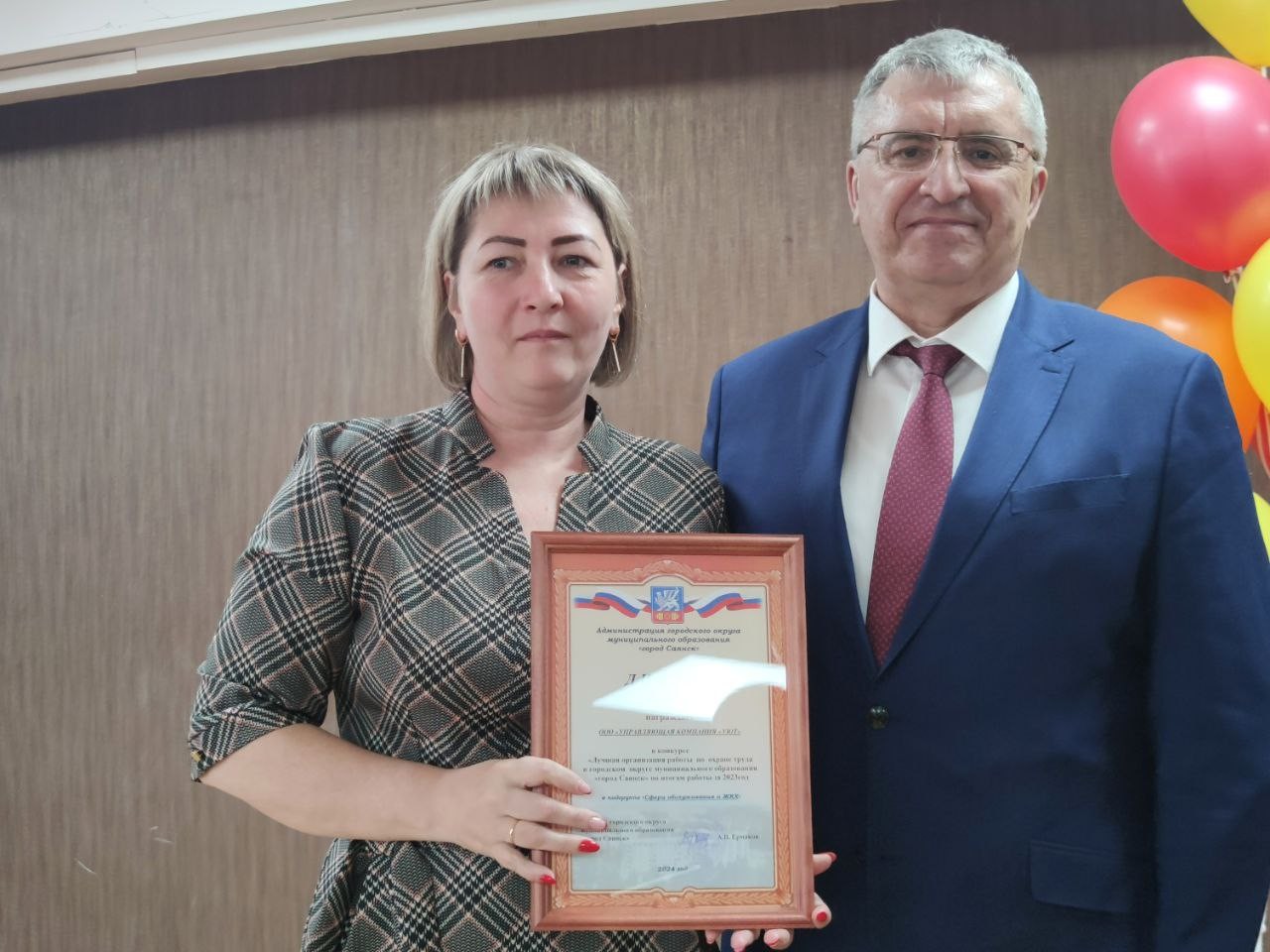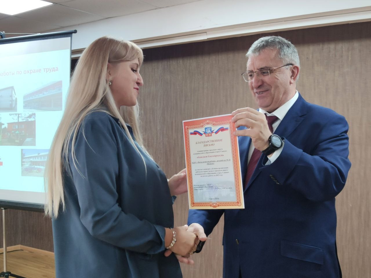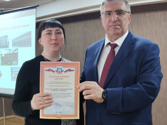 В преддверии Всемирного дня Охраны труда «Безопасный труд - счастливое будущее!» и.о. мэра городского округа Ермаков Александр Владимирович вручил благодарность от Министра труда и занятости Иркутской области Кирилла Клокова за добросовестный труд и профессиональные успехи в сфере труда и занятости населения на территории Иркутской области, коллеге, консультанту по управлению охраной труда администрации города Саянска Тукаленко Татьяне Григорьевне.