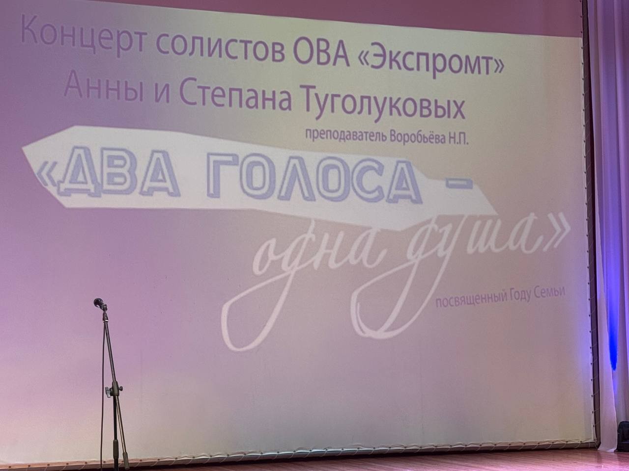 «Два голоса - одна душа" - под таким названием во Дворце культуры "Юность" состоялся концерт обучающихся эстрадного отделения Детской школы искусств, солистов образцового вокального ансамбля "Экспромт" Анны и Степана Туголуковых, который был посвящен Году семьи.
