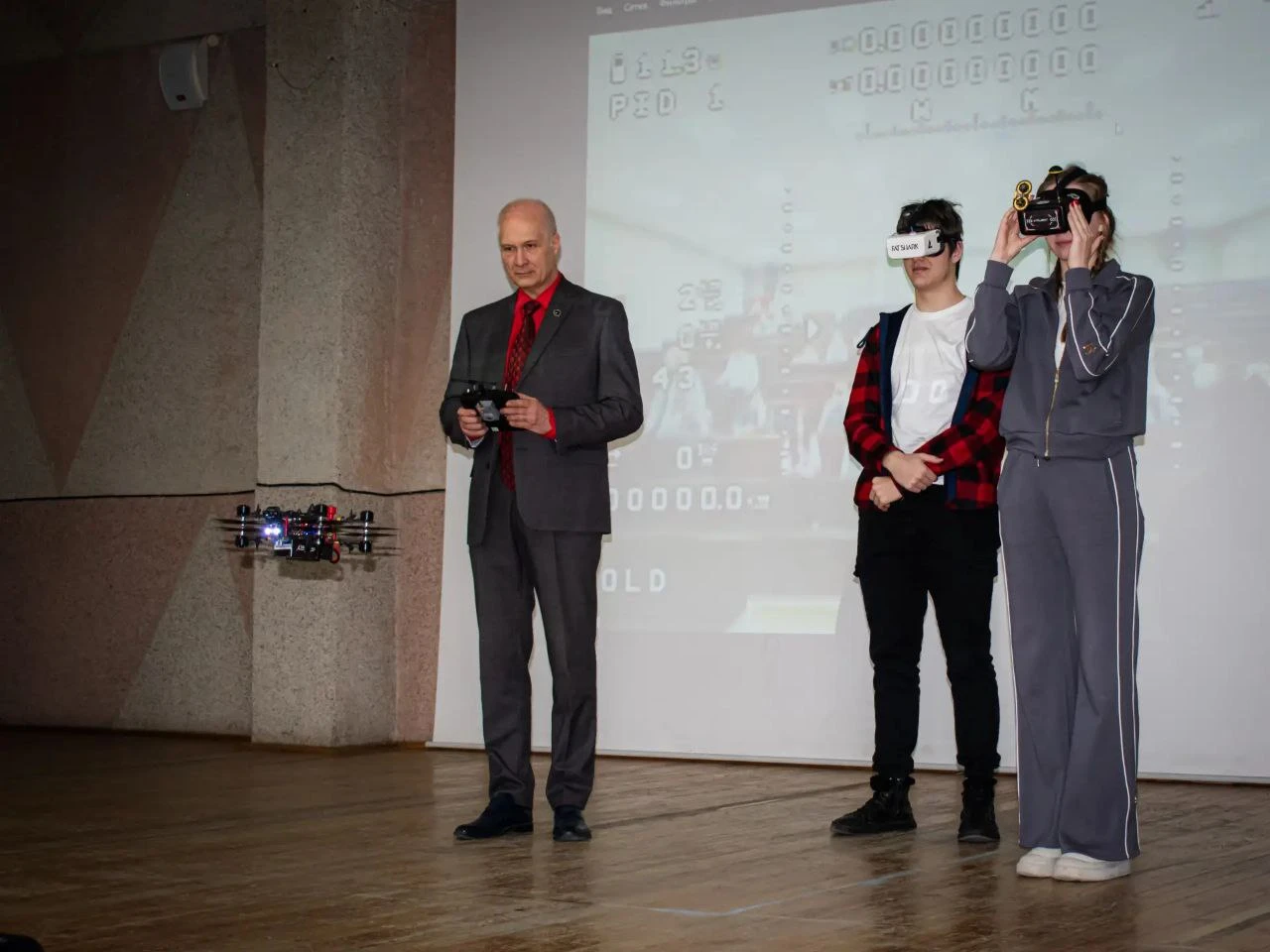 Заведующий кафедрой промышленной электроники Сергей Эльхутов прочитал лекцию о современных достижениях в области беспилотных летательных систем. Преподаватель не ограничился изложением теории: во второй части своего выступления он провел для гостей университета мастер-класс по управлению fpv-дроном.