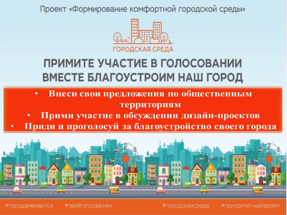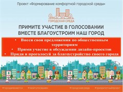 Вы можете принять участие в голосовании, а также внести свои предложения на официальном сайте администрации города /page/5783 в разделе «Формирование комфортной городской среды/голосование» или оставить свои предложения в администрации, в холле первого этажа, где размещен специальный ящик для голосования.