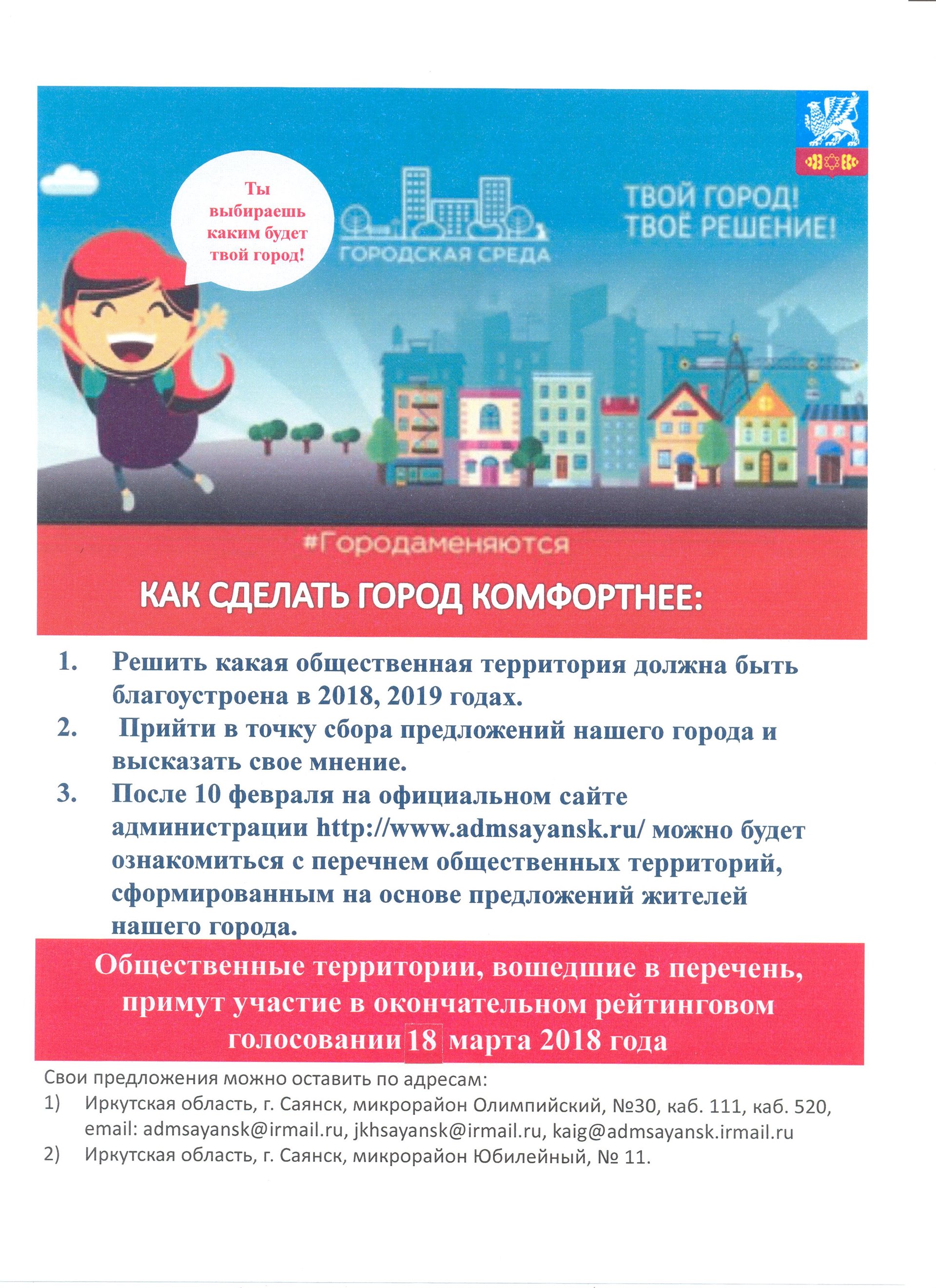 По результатам общественного обсуждения, в котором приняло участие 2 799 человек, в целях определения перечня общественных территорий, подлежащих включению в 2018 году и в 2019 году в первоочередном порядке в муниципальную программу «Формирование современной городской среды на территории муниципального образования «город Саянск» на 2018-2022 годы», общественными территориями, планируемыми к благоустройству в 2018 году, являются: