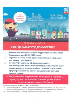 В целях проведения рейтингового голосования в феврале 2019 года, объявляется прием предложений в целях определения перечня общественных территорий, подлежащих благоустройству в первоочередном порядке в 2020 году.
