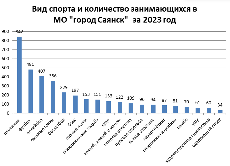 В городе Саянске развивается более 20 видов спорта: плавание, футбол, баскетбол, волейбол, ушу, бокс, самбо, скандинавская ходьба, лёгкая атлетика, тяжёлая атлетика, лыжный спорт, пауэрлифтинг, спортивная аэробика, художественная гимнастика, хоккей, шахматы кикбоксинг, горные лыжи, кудо и другие.